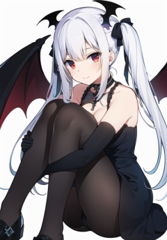 (best quality), ((masterpiece)), (highres), illustration, original, extremely detailed wallpaper.  <lora:cutegirl-000008:0.7>1girl, solo, gloves, pantyhose, twintails, long hair, smile, hair ornament, elbow gloves, wings, red eyes, looking at viewer, white gloves, thighband pantyhose, dress, hair ribbon, ribbon, bangs, black pantyhose, blush, closed mouth, white hair, sitting, bare shoulders, black ribbon, knees up, very long hair, breasts, white background, black dress, demon wings, sleeveless, black footwear, two-tone background, sidelocks, hugging own legs, choker, cross, simple background, sleeveless dress, black choker, cross hair ornament, medium breasts, bat wings