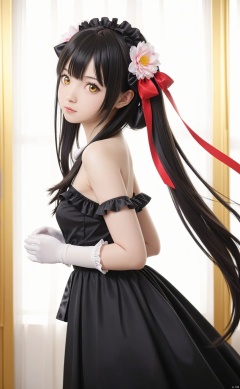 masterpiece,best quality,very long hair,cowboy shot,4349,1girl,letterboxed,solo,long_hair,yellow_eyes,black_hair,dress,looking_at_viewer,very_long_hair,bare_shoulders,ribbon,flower,hair_ornament,hair_flower,black_dress,gloves,frills,red_ribbon,elbow_gloves,bubble,hair_ribbon,bow,from_side,bangs,akemi_homura,