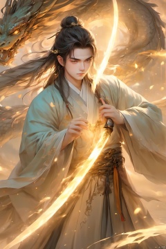 1boy, closed mouth, evening,Glowing Sword, jewelry, long hair,Ancient Chinese Hanfu,Photofluid,Light magic,Chinese Photon Dragon,dawn, long sleeves,Photoparticle, looking at viewer, magic, male focus, solo, twilight