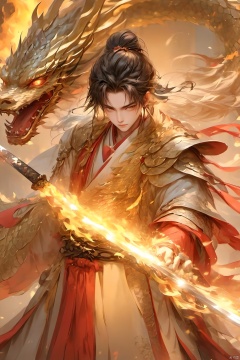 1boy, armor, braid,Chinese Dragon,Golden Magic,Chinese Silver Metal Dragon,China Golden Dragon,Ancient Chinese Hanfu, fire, jewelry, sword, weapon