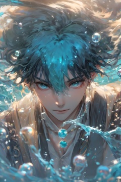 1boy, afloat, air bubble, aqua hair, blue hair, bubble, caustics, floating hair, jewelry, long hair, looking at viewer, male focus,fluid,Water magic ,Fluid hair,Flowing water, necklace, ocean, partially submerged, solo, splashing, submerged, underwater, water, water drop, waves, wet