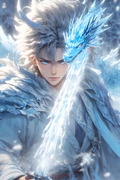 1boy, blue eyes, closed mouth, eyelashes, face, floating hair, glowing, holding,Ice Magic,Ice crystal,Icicles,ice,Chinese Ice Dragon, holding weapon,Chinese clothing, looking at viewer, male focus, solo, sword, weapon, white hair