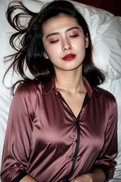PHOTOREALISTIC REALISTIC,masterpiece,best quality,highres,ultra detailed,8k,1woman,portrait,shirt,makeup,lipstick,closed eyes,wangzuxian,strobe lighting,lying,on back,on bed, <lora:wangzuxian_alexnsfw4.1:0.6>
