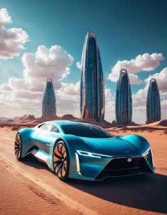 sci-fi, cinematic photo, futuristic design of electro car, majestic, desert city, skyscrapers, perfect lighting, clouds, vibrant, film grain