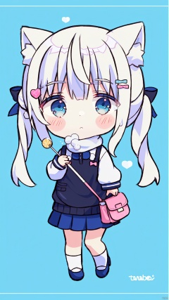 1girl, solo, long hair, looking at viewer, bangs, blue eyes, skirt, shirt, hair ornament, long sleeves, bow, holding, animal ears, twintails, very long hair, closed mouth, standing, full body, white shirt, white hair, pleated skirt, food, shoes, socks, hairclip, black skirt, bag, hair bun, chibi, scarf, black footwear, sweater, sleeves past wrists, double bun, low twintails, blush stickers, holding food, candy, :<, puffy long sleeves, sweater vest, lollipop, shoulder bag, blue scarf, loose socks, holding candy, holding lollipop
