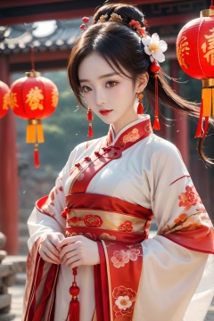 best quality,masterpiece,16k,1girl,Chinese New Year,Welcoming Spring Girl,Spring welcome clothing,Hanfu,Chinese knot,Upper body,Red Theme,Black gold earphones,White clothing,Red flower headwear,front,Gold Bell Earrings,Black gold forehead protection,Above the knee,ancient Chinese architecture,Red Lantern,Zhang **** Jie Cai,Full of joy and joy,Spring Festival couplets,Ancient Chinese script,Brown eyes,Clothing printing