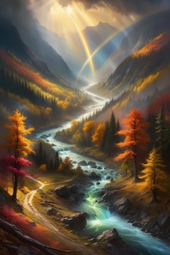 painting of a river runs through a beautiful and colorful fairy tale valley, thick autumn forest, storm, tornado, haze, magic, sun beams, volumetric lighting, beautiful, rich deep colors, painted, intricate, sharp focus, ultra detailed, astrophotography, magnificent, celestial, ethereal, epic, magical, dreamy, chiaroscuro, atmospheric lighting,