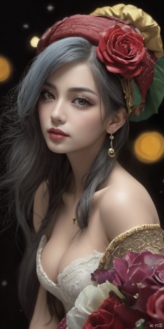 1girl,Han Chinese girls,Flower beret,yellow Hanfu,chinese clothes,large breasts,red rose,jewelry, earrings,lips, makeup, portrait, eyeshadow, realistic, nose,{{best quality}}, {{masterpiece}}, {{ultra-detailed}}, {illustration}, {detailed light}, {an extremely delicate and beautiful}, a girl, {beautiful detailed eyes}, stars in the eyes, messy floating hair, colored inner hair, Starry sky adorns hair, depth of field, large breasts,cleavage,blurry, no humans, traditional media, gem, crystal, still life, Dance,movements, All the Colours of the Rainbow,zj,