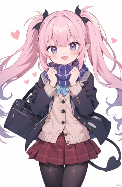 1girl, solo, long hair, looking at viewer, blush, smile, open mouth, bangs, blue eyes, skirt, long sleeves, twintails, very long hair, school uniform, purple eyes, jacket, pink hair, heart, pantyhose, sidelocks, pleated skirt, open clothes, pointy ears, fang, bag, scarf, black jacket, plaid, black pantyhose, hands up, red skirt, plaid skirt, blazer, cardigan, own hands together, breath, heart tail