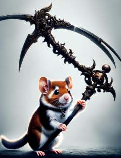hamster holding a DonM5cy7h3 scythe, creascent blade,<lora:DonM5cy7h3-000006:0.8>