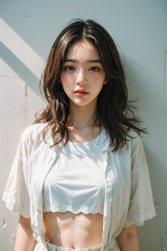 photorealistic, cinematic film still, 1girl, shadow, t-shirt, open shirt, messy long hair, light master, Purity Portait