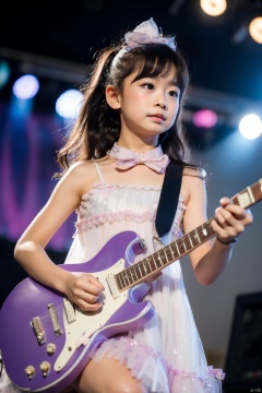 ,sex_dress,(playing | guitar), confident, stage lighting, center stage, crowd watching, rock and roll, child,sparkle print, takei film