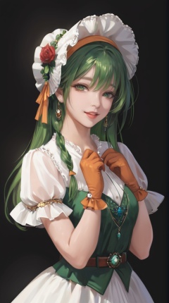 (best quality), ((masterpiece)), (highres), illustration, original, extremely detailed,  <lora:ACG ART_V:0.7>1girl, solo, gloves, green eyes, dress, flower, green dress, elbow gloves, gem, smile, looking at viewer, drill hair, hat, green gemstone, hat feather, belt, rose, jewelry, bangs, hat flower, twin drills, black background, frills, bow, green gloves, red flower, long hair, bonnet, green hair, parted lips, orange bow
