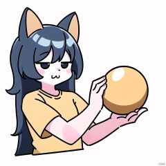 (\MBTI\),solo,long hair,simple background,yellow shirt,black hair,1girl,white background,holding,animal ears,closed mouth,upper body,short sleeves,male focus,cat ears,hand up,:3,ball,yellow shirt,sportswear,cropped torso,holding ball