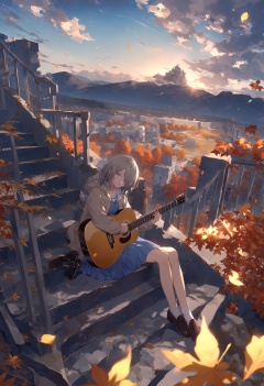 masterpiece, best quality <lora:sd_xl_dpo_lora_v1-128dim:1>,1girl, solo, looking at viewer , jacket, blue eyes, upper body, long sleeves, hair over one eye ,flower, sky, scenery, outdoors, star (sky), starry sky, blue flower, field, cloud, night, petals, night sky, building, flower field, ruins, solo, instrument, sitting, shoes, leaf, hood down, guitar, hood, outdoors, hoodie, loafers, autumn leaves, stairs, holding instrument, school uniform, holding, long sleeves, playing instrument, music, falling leaves, autumn, day, tree, bangs, smile, dutch angle, electric guitar, plectrum, cloud, sky, outdoors, scenery, solo, reflection, tree, blue sky, leaf, day, autumn leaves, dress, water, cloudy sky, standing, wide shot, petals, autumn, shoes, ripples, blue dress, falling leaves, short sleeves, blurry