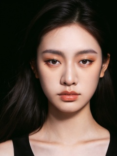 close-portrait,young asian female,subtle makeup,rosy cheeks,dark eyes,natural eyelashes,light eyeshadow,high-key lighting,clear skin,studio light,fashion photograph,best quality,masterpiece,black background,