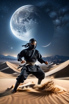 A ninja performing Earth-style ninjutsu in the desert at night. The scene is illuminated by the moon and stars, casting long shadows and highlighting the ninja's focused expression. Sand and rocks are levitating around the ninja, caught in the act of manipulation. The desert landscape is visible in the moonlight, adding a mysterious atmosphere to the scene.