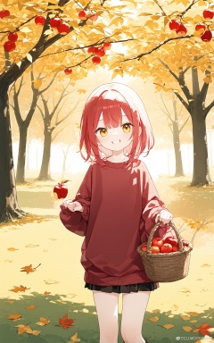 A young girl, embracing a basket of freshly picked apples, under a blossoming cherry tree in autumn, surrounded by fallen leaves in shades of red and gold, wearing an oversized woolen sweater, ankle boots, with rosy cheeks and a joyful grin, sunshine filtering through the colorful foliage casting dappled light upon her, against a backdrop of a charming countryside orchard., ((poakl))