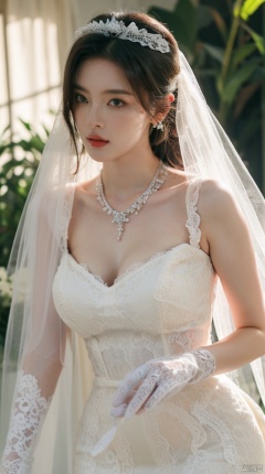(green lace wedding dress:1.39), veil, wedding gloves, holding flowers,Crystal Earring, Crystal Necklace,