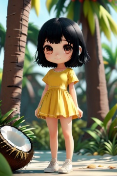 1girl in white T-shirt and yellow dress,white shoes,black hair,black eyes,delicate facial features,big head,big eyes,small body,smiling,with a coconut in her hand,full body,coconut tree,chibi,cute,diamond luster,clay material,precision mechanical components,OC rendering,niji,cartoon,highres,expressive,IP,3D,C4D,Blender,ray tracing,16K,HD,chibigirl,, (best quality), ((masterpiece)), (an extremely delicate and beautiful), original, extremely detailed wallpaper
