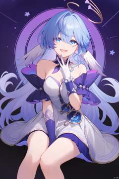 nai3, 1girl, solo, ahoge, virtual youtuber, , flower, looking at viewer, sitting, open mouth, smile,bangs,between legs, :d, hand between legs, purple background, fang, feet out of frame,haoche\\\\\\\\\\\\\\zgn,1girl,long hair,halo,blue eyes,gloves,bangs,white dress,bare shoulders,blue hair,blue footwear<lora:EMS-310429-EMS:0.800000>