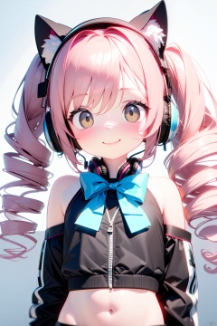loli,1girls, bare_shoulders, bow, bowtie, cat_ear_headphones, drill_hair, hand_on_headphones, headphones, headset, long_hair, looking_at_viewer, midriff, multiple_girls,pink_hair, smile, twin_drills
