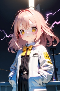 (masterpiece, best quality),1girl,solo,cuty face,Beautiful detailed eye,upper body,ray tracing,Reflected light,(very detailed light),(Beautiful Lighting),(best quality), ((masterpiece)), (highres),(loli),(petite:1.4),(white open jacket:1.4),rain,shiny clothes,white collared shirt,hair flower,fipped hair,floating hair,(blonde electricity:1.4),light smile,hands in pockets,white dress,yellow bowtie,(Yellow eyes:1.2),(Pink hair:1.2),(solo),hair flowing over, messy hair, aura,long hair, lamppost,white belt,