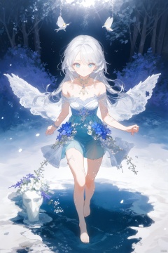 extremely delicate and beautiful,(fantasy),ultra detailed,(extreme detailed illustration),highres,translucent hair, (glowing inner hair),the perfect appearance,(Elk horn on head:1.15),white hair,[blue eyes | yellow eyes],(barefoot sandals:1.25),(forest:1.2),(lace-trimmed dress:1.15),(chiaroscuro lighting:1.2),see-through clothes,(profile:0.85),(looking at viewer:1.25),(flower bracelet),elf,short hair,(mature woman),walking,from above, (fairy wings:1.1), 1girl, xinniang,msn,backlight