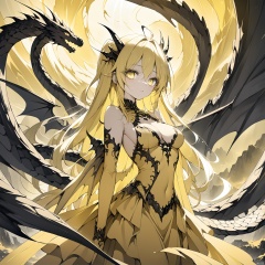 (anime art: 1.21), (dragon: 1.1), (dragon in background: 1.21), 1girl with wings on back, looking at viwer, snake eyes, (yellow theme: 1.5), (monochrome: 1.1), (ethereal beauty: 1.4), (captivating lighting: 1.2), (ethereal aura: 1.3), (mysterious ambiance: 1.2), (thunder in the distance: 1.2), (fantasy art: 1.3), (ethereal scene: 1.3), , masterpiece,best quality,8k,insane details,intricate details,high detail,((masterpiece)), ((best quality))<lora:EMS-260925-EMS:0.500000>