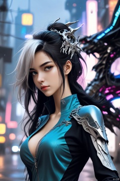 {{master piece}},best quality,illustration,1girl,small breast,beatiful detailed eyes,beatiful detailed cyberpunk city,flat_chest,beatiful detailed hair,wavy hair,beatiful detailed steet,mecha clothes,robot girl,cool movement,sliver bodysuit,{filigree},dargon wings,colorful background,a dragon  stands behind the girl,rainy days,{lightning effect},beatiful detailed sliver dragon arnour,(cold face)