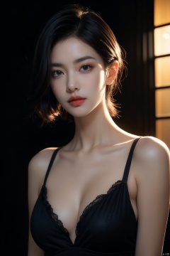 (RAW photo, best quality), (realistic, photo-realistic:1.2), 1girl,middle breasts,Cleavage,undergarments,Upper body, high quality, (high detailed skin:1.4), puffy eyes, gorgeous hair, (dark room:1.3), (rim lighting:1.3), (dimly lit:1.3), (dark night:1.3), indoors, portrait, black hair, dark background, short hair, 1 girl