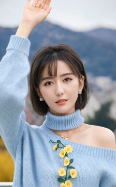 (masterpiece), (best quality), 1girl, watch, solo, wristwatch, floral background, sweater, looking at viewer, jewelry, upper body, bangs, flower, blush, off shoulder, necklace, long sleeves, hands up, closed mouth, yellow eyes, grey hair, black sweater, own hands together, open clothes, jacket, short hair, shirt, blue background, turtleneck, cardigan, blue sweater,[artist mmd], yaya