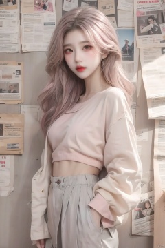 1girl, solo, long hair, looking at viewer, skirt, shirt, standing, jacket, pink shirt, pink hair, newspaper wall, lips, wall, gray wall, newspaper are covered with walls, put one hand in pocket, body close to the wall, sleeves past wrists, grey eyes, red lips, mjuanlian, (/qingning/), (\ji jian\), (\meng ze\)