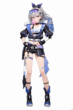 score_9,score_8_up,score_7_up,best quality,masterpiece,source_anime,8k,best quality,masterpiece,(ultra-detailed),(high detailed skin),symmetrical,(full body),white background,standing,looking at viewer,(solo),hand on hip,,yinlang, bronya zaychik, eyewear on head, grey eyes, grey hair, long hair, drill hair, gloves, bubble blowing, jacket, shorts, chewing gum,fingerless gloves, navel, mesh socks,gloves,blackdress,blacksingle thigh high,earrings,jewelry,(white background, simple background),(beautiful_face),((intricate_detail)),clear face,((finely_detailed)),fine_fabric_emphasis,((glossy)),full_shot, hquan,purple eyes<lora:EMS-323771-EMS:0.800000>