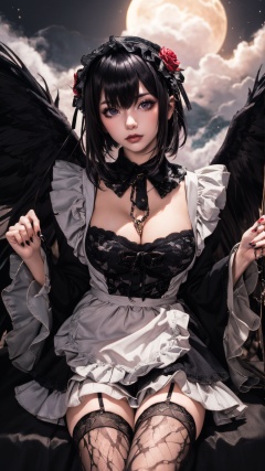 tutututu,1girl,solo,Kuroe Shizuku,lolita fashion,apron,pantyhose,gothic lolita,black dress,frills,hair flower,hair ornament,chain leash,black nails,wide sleeves,lace trim,long sleeves,rose,black footwear,black necktie,maid,fishnets,maid headdress,detached collar,red flower,thighhighs,hairband,chain,floral print,lolita hairband,garter straps,black thighhighs,lace,<lora:Kuroe Shizuku_Lolita-000007:0.5>,((best quality)),((masterpiece)),(detailed),alluring succubus,ethereal beauty,perched on a cloud,(fantasy illustration:1.3),enchanting gaze,captivating pose,delicate wings,otherworldly charm,mystical sky,(Luis Royo:1.2),(Yoshitaka Amano:1.1),moonlit night,soft colors,(detailed cloudscape:1.3),(high-resolution:1.2),