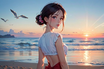 dream, masterpiece, best quality, highres, ultra high res, anime, 1 girl, evening, backlight, looking at viewer, outdoor, details eyes, details lips, beach, wallpaper forced,seagull