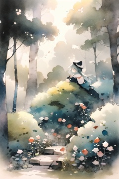 forest,watercolor_(medium),ink and wash,1girl,watercolor \(medium\),