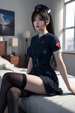 HDR,UHD,8K,best quality,highres,absurdres,masterpiece,Highly detailed,ultra-fine painting,physically-based rendering,1girl,solo,long hair,sky,(skirt),sitting,room,black stockings,((nurse)),<lora:qilin-1212-000010:0.65>,