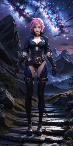 <lora:AK_20240305124859-000007:0.75>,AK,scenery,sky,star \(sky\),starry sky,outdoors,night,tree,night sky,cloud,mountain,nature,milky way,1girl,solo,pink hair,full body,short hair,gloves,belt,jacket,cleavage,looking at viewer,thighhighs,medium breasts,alternate costume,cropped jacket,boots,jewelry,open jacket,black gloves,bangs,ponytail,blue eyes,hair ornament,open clothes,purple eyes,, (raw photo:1.2),((photorealistic:1.4))best quality,masterpiece,illustration,an extremely delicate and beautiful,extremely detailed,CG,unity,8k wallpaper,Amazing,finely detail,masterpiece,best quality,official art,extremely detailed CG unity 8k wallpaper,absurdres,incredibly absurdres,huge filesize,ultra-detailed,highres,extremely detailed,beautiful detailed girl,cinematic lighting,1girl,pale skin,tall female,(perfect body shape),skinny body,Slender legs,, pale skin,tall man,long legs,thin leg,