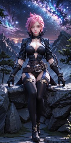 <lora:AK_20240305124859:0.75>,AK,scenery,sky,star \(sky\),starry sky,outdoors,night,tree,night sky,cloud,mountain,nature,milky way,1girl,solo,pink hair,(sitting:1.1),short hair,gloves,belt,jacket,cleavage,looking at viewer,thighhighs,medium breasts,alternate costume,cropped jacket,boots,jewelry,open jacket,black gloves,bangs,ponytail,blue eyes,hair ornament,open clothes,purple eyes,, (raw photo:1.2),((photorealistic:1.4))best quality,masterpiece,illustration,an extremely delicate and beautiful,extremely detailed,CG,unity,8k wallpaper,Amazing,finely detail,masterpiece,best quality,official art,extremely detailed CG unity 8k wallpaper,absurdres,incredibly absurdres,huge filesize,ultra-detailed,highres,extremely detailed,beautiful detailed girl,cinematic lighting,1girl,pale skin,tall female,(perfect body shape),skinny body,Slender legs,, pale skin,tall man,long legs,thin leg,