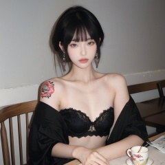 1girl, solo, looking at viewer, short hair, bangs, black hair, jewelry, sitting, jacket, upper body, earrings, blunt bangs, cup, lips, Bra, small amount of dress lace, grey eyes, strapless, tattoo, chair, table, bandeau, tube top, arm tattoo, A girl with a tattoo on her right should,clean background, Light master