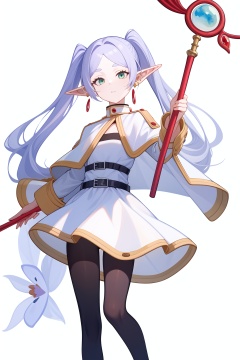 <lora:芙莉莲:1:lbw=char>,fulilian,1girl,twintails,earrings,long sleeves,white capelet,best quality,white dress,black pantyhose,high quality,belt,holding staff,blue flower,, (masterpiece,best quality,high quality:1.4),absurdres,