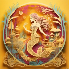 paper-cut of a mermaid with enchanting song in an vibrant colored enchanted wonderland, magical, whimsical, fantasy art concept, steampunk, intricate details, best quality, masterpiece, ultra sharp, yellow theme background,