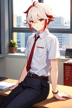 masterpiece,best quality,light,(in office:1.3),kaedehara kazuha,1boy,male focus,solo,red eyes,multicolored hair,bangs,streaked hair,red hair,looking at viewer,hair between eyes,suit,sitting,from side,<lora:kazuha:0.7>,