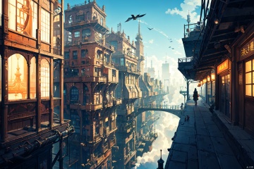 (masterpiece:1.2), best quality,fantasy,(steampunk:1.2), complex, street, city, steam, machine,dreamlike,scenery,future,orange light,blue sky,cityscape,blue spot,panorama,steam,((air city)),bird angle,nijistyle,houtufeng,midjourney