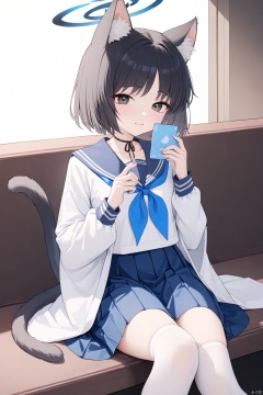 kikyou,short hair, bangs, skirt, shirt, black hair, long sleeves, holding, animal ears, sitting,school uniform, tail, white shirt, pleated skirt, japanese clothes, serafuku, choker, socks, cat ears, sailor collar, black eyes, blue skirt, cat tail, neckerchief, animal ear fluff, black choker, halo, cat girl, white socks, blue sailor collar, bench, blue neckerchief, scissors