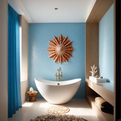 Light blue and sandy tones, mosaic tile backsplash, seashell and coral decor, freestanding bathtub, breezy curtains, natural light, driftwood elements, spa-like atmosphere