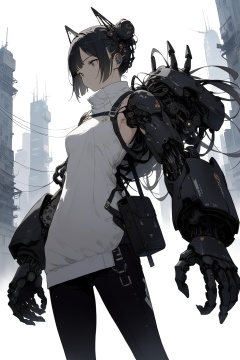 large mechanical arms, 1girl, cyberpunk, science fiction, city, cowboy shot,