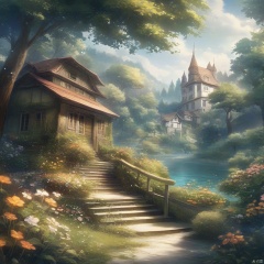 Shuwuu, tree, scenery, stairs, no humans, outdoors, house, window, plant, fantasy, nature, sky, grass, building, water, flower, overgrown, forest