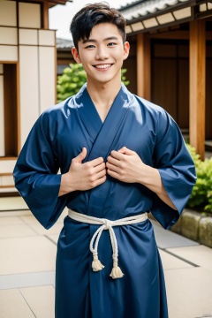 1boy,male focus,japanese clothes,yukata,muscular male,muscular,paw pose,solo,looking at viewer,grin,black hair,blue eyes,short hair,flower,petals,best quality,amazing quality,best aesthetic,absurdres